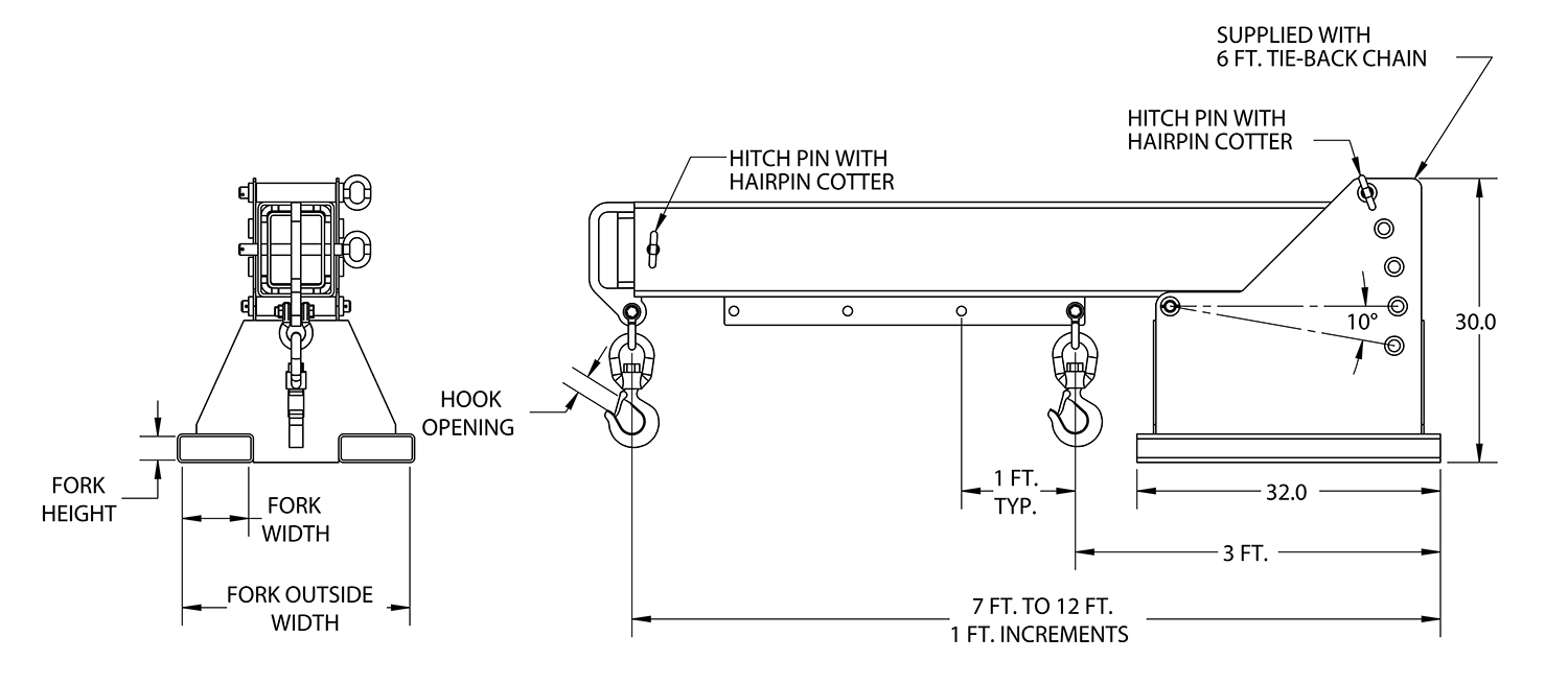 Harrington Telescoping Pivot Fork Truck Boom, 1-1/2 Ton Capacity, HTBP-30
